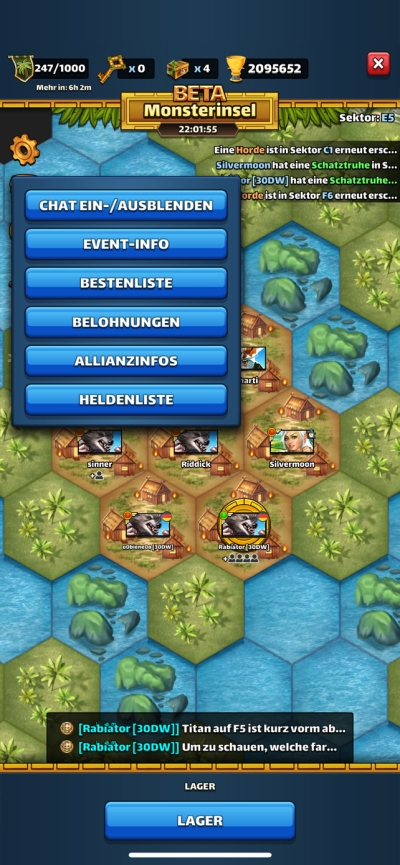 - Bestenliste: Anzeige der Top-Allianzen und in welchem Schwierigkeitsgrad man kämpft.